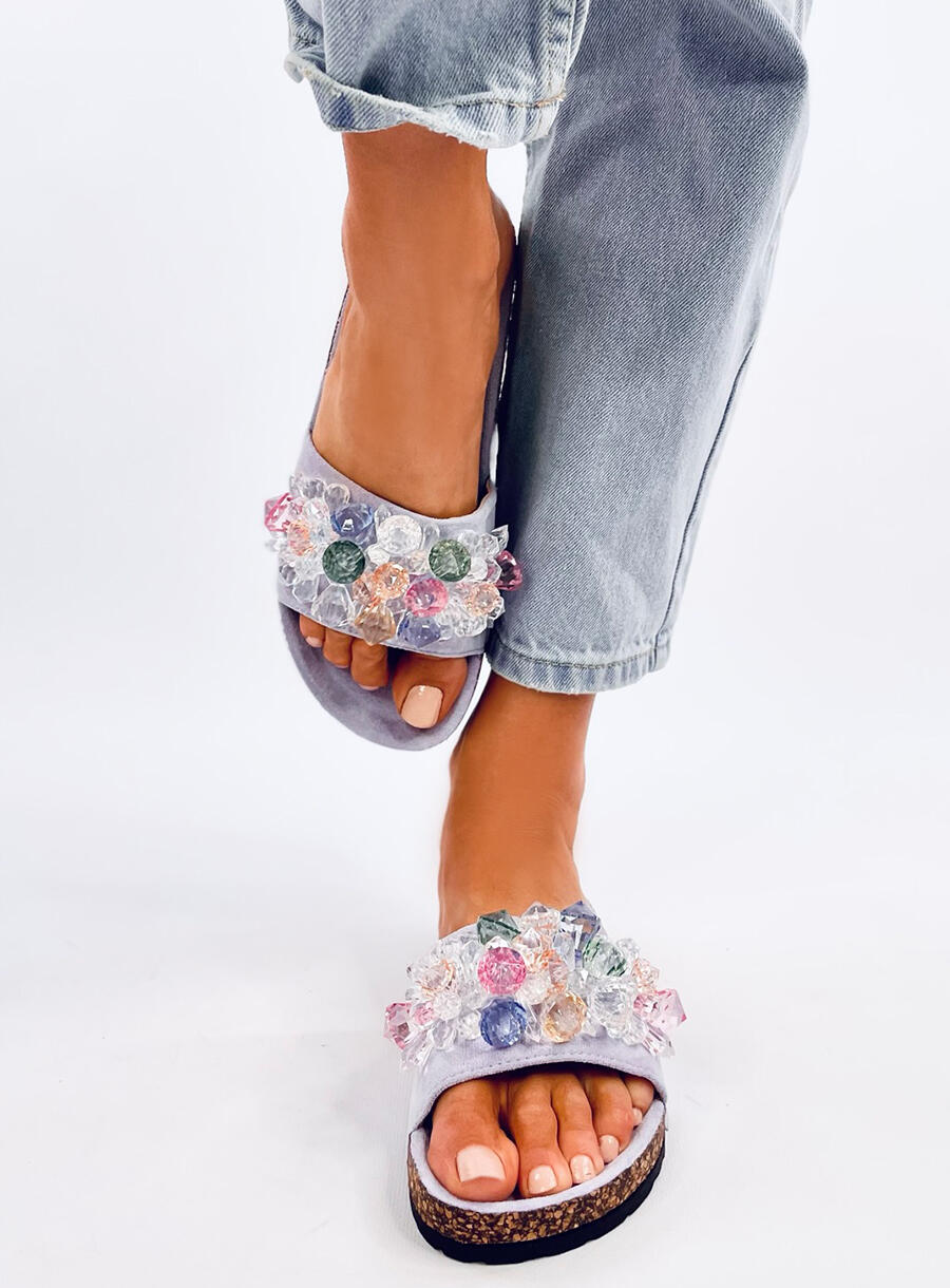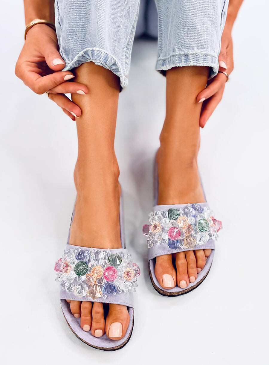 The suede strap decorated with an appliqué of glittering multicoloured crystals gives the shoes a unique charm.