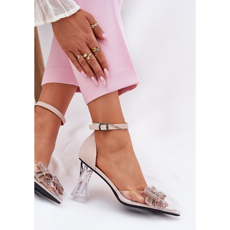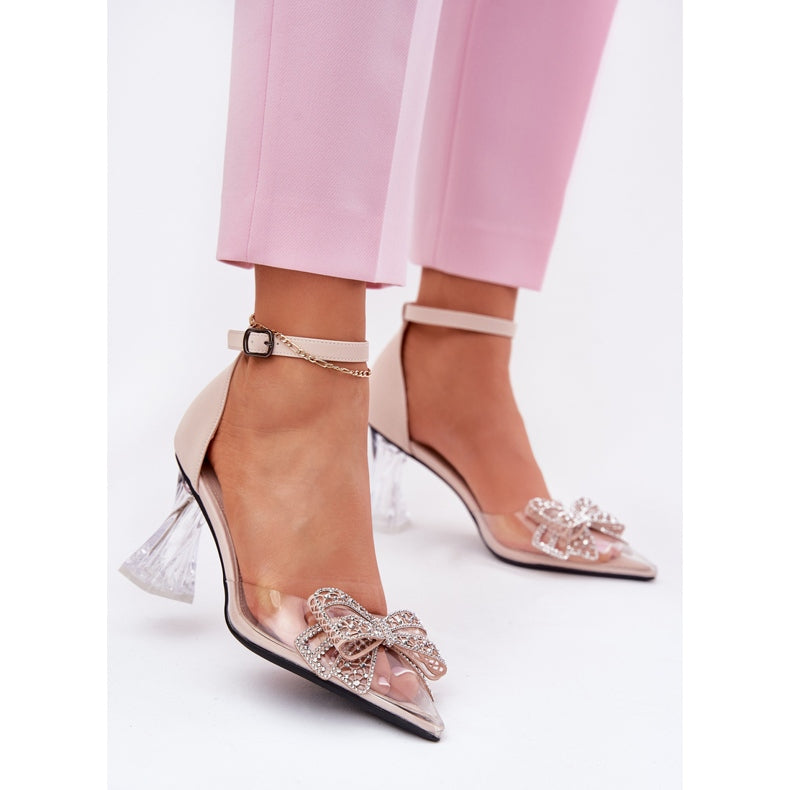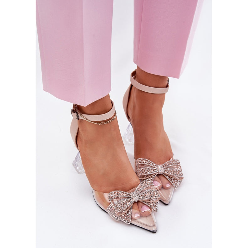 At the front, there is a bow with embellishment, and a column heel provides stability and comfort.